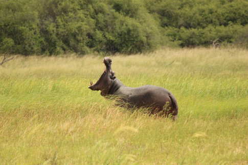 We rijden door naar Kasane waar we een camping zoeken zodat we overdekt kunnen zitten en koken. We wachten een dagje tot het weer opklaart en dan gaan we het bekendste nationale park van Botswana in, Chobe. We hebben veel mensen gesproken die Chobe in geweest zijn en op het stukje waar wij nu zijn hebben zij allemaal het meeste gezien. Sommige hebben het over wel duizend olifanten! Dat willen wij wel zien natuurlijk. Samen met Joep en Anique staan we 's morgens om 6 uur bij de gate. We rijden vol goede moed door het park, langs het water, door de kleine bospaadjes, bij de uitkijkposten, we doen alles wat we kunnen maar we zien vrijwel niks. We zin één buffel ver weg tegen gekomen en een aantal nijlpaarden op een grote afstand.
