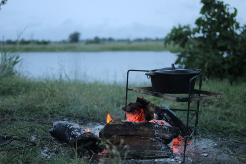 Als we bedacht hebben waar we ongeveer willen wild kamperen (een plekje gevonden op Ioverlander) stuiten we op een rivier. We moeten de rivier over willen we daar komen.... Er valt slecht te zien hoe diep de rivier is, al lijkt het op het eerste gezicht niet heel diep. Toch weet je dat er nijlpaarden in leven en die zijn toch best groot. Ik loop het water in zolang je de bodem kunt zien en probeer er met een stok achter te komen hoe diep het is. Iedereen vindt het inmiddels een beetje spannend (behalve Jim, zijn auto rijdt hier tenslotte toch niet bij) maar aangezien we met twee auto's zijn is het risico ook niet heel groot. Joep en Anique gaan eerst met de Land Rover. Het lukt! We zien dat het eigenlijk helemaal niet zo diep is en ook Pablo gaat er met gemak doorheen. We vinden een prachtige plek om te kamperen, zetten de luifel op, maken vuur en beginnen aan het potjie. Rond een uur of 17:30 komt er ineens een safari auto. Dat we daar absoluut niet mogen slapen, dat het levensgevaarlijk is en als we niet weg gaan dat ze ons moet rapporteren en we een flinke boete krijgen, shit! Ze adviseert ons om naar de camping te gaan die niet ver weg is, maar wij willen natuurlijk niet €50,00 voor een nachtje betalen. We besluiten helemaal terug te racen naar onze wild kampeer plek van de nacht ervoor. Dit is nog een heel eind en net voor het donker komen we aan.