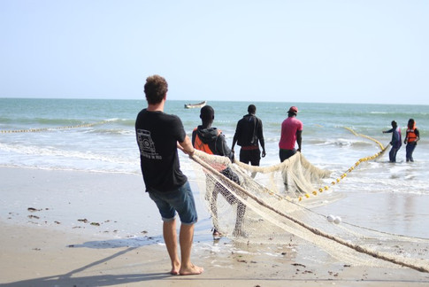 We hebben ondertussen al langere tijd contact met een stel uit Engeland en zij blijken naar Cap Skirring te gaan. Omdat het ons wel leuk lijkt om wat andere reizigers te ontmoeten besluiten we even door te rijden daarheen, dan kunnen we op de terugweg rustig de omgeving bekijken. Cap Skirring heeft een prachtig strand en we besluiten een rondje over het strand te gaan rijden, dit blijft toch een heerlijk gevoel! Ondertussen houden we onze ogen open voor een mooi plekje om te kunnen slapen maar eigenlijk staat er overal veel wind. Op het moment dat we besluiten onze mega handige app Ioverlander (als je ooit waar dan ook ter wereld op reis gaat, super handig!) te raadplegen om te kijken waar de wildkampeerplek is zien we op de kaart dat we al in Guinee Bissau zijn. Oeps, blijkbaar loopt er een grens over het strand. We maken even snel een foto, toch bewijs dat we er geweest zijn, en rijden weer terug. Terwijl we nog een stukje over het strand rijden komen we een aantal mannen tegen die over het hele strand aan een touw staan te trekken. Omdat we er zo niet langs kunnen besluiten we te helpen. Het touw is enorm, er komt geen eind aan, al snel zijn wij kapot maar we zijn nog lang niet klaar. Toch blijven we helpen want we zijn eigenlijk mega nieuwsgierig naar wat ze nou aan het doen zijn, Uiteindelijk blijkt het een heel groot visnet te zijn en staat er aan de andere kant van het strand nog zo'n groep mannen keihard te werken, Ze halen behoorlijk wat vis binnen maar zelf vinden ze het maar een magere vangst. Desondanks zijn ze erg blij met onze hulp en bieden ze ons wat vis aan. In eerste instantie bedanken we daarvoor, we houden allebei tenslotte niet echt van vis. Dan bedenken we ons, verser dan dit ga je het niet krijgen en misschien moeten we het gewoon proberen, we vinden vast iemand die het voor ons kan bereiden!