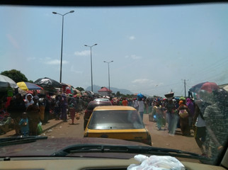 Guinee, wat een prachtige natuur! Zo mooi hebben we het nog niet gezien, we wanen ons een beetje in het oerwoud. De hoofdweg is niet helemaal af en ongeveer 30 kilometer rijden we off road. Het regent heel zachtjes en de kleuren zijn prachtig. Het uitzicht is geweldig en we genieten van deze prachtige natuur. We wilden graag naar de watervallen maar besluiten in LabƩ te overnachten omdat we pas rond 20.00 daar aankomen en het inmiddels toch alweer donker is. We vinden het niet prettig om in het donker in een stad aan te komen, alles ziet er dan toch minder gezellig uit, hoewel dat vaak meer een gevoel is. We slapen op de parkeerplaats van een hotel en ontmoeten daar twee Amerikanen. Zij werken voor Peace Corp als vrijwilligers in Guinee en Senegal. Een van de twee, Nick, moet maandag (het is zaterdag) naar Conakry en aangezien wij wel wat meer nuttige informatie over Guinee willen besluiten we dat wij hem daarheen zullen brengen.