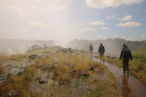 In Zambia/Zimbabwe gaan we naar de Victoria Falls. Nog zo'n gekoesterde droom van mij. We gaan samen met Anique en Joep heel erg vroeg op pad, hopende dat het dan nog niet zo druk is op zondag. Het is een prachtige stralende dag maar toch hebben we onze regenjassen mee, voorbereidt op wat komen gaat. Om aan de kant van Zimbabwe te komen moet je door de grens en dan de brug over. Wij zijn met z'n vieren in een druk gesprek terwijl we die brug op lopen. Op het moment dat we op de brug aankomen valt er een stilte. Niemand weet meer waar we het over hadden en staat vijf minuten lang ademloos naar dit enorme natuurgeweld te kijken. Vanaf hier is het al prachtig en dan zijn we er eigenlijk nog niet eens. We lopen door, besparen natuurlijk op een taxi, en uiteindelijk komen we bij de ingang aan. Dit lijkt een enorme toeristische attractie te zijn, daar hebben we dus Ʃcht geen zin in.... Als we door lopen blijkt dat dit hier helemaal niet het geval is. Er is een mooi pad gemaakt en er zijn uitkijkpunten maar alles is van natuurlijke materialen en er zijn eigenlijk bijna geen mensen. Op de meeste plekken staan wij gewoon helemaal alleen naar al het water te kijken, dit geeft het gevoel alsof wij alleen op de wereld zijn met al dit water, geweldig! De waterval is enorm en de spray nog intenser. De spray kan wel tot 400 meter boven de watervallen uitkomen en dan op bijna 50km afstand gezien worden. Klinkt mega vet. Resultaat, als je er voor staat zie je soms gewoon helemaal niks! Wij hadden best veel geluk. Het eerste stuk van de watervallen is sowieso heel duidelijk te zien, wij begrepen ook nog steeds niet zo goed waarvoor wij onze regenjassen mee moesten nemen. Tot we een stukje verder lopen. Op de uitkijkpunten kom je dusdanig dichtbij de watervallen dat er een ware stortbui over je heen valt. Je bent echt direct doorweekt! Maar we hebben geluk, heel regelmatig trekt de spray even op, je krijgt dan een prachtige uitzicht op het enorme water en de kracht waarmee dat naar beneden komt.