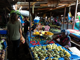 De markten zijn geweldig. Je gaat op zoek naar de straat waar de meeste winkeltjes langs de weg liggen, daar verkopen ze dan vaak wat groente en tupperware en misschien wat t-shirts. Als je de juiste plek weet te vinden loop je via een steegje een markt in. Van de buitenkant verwacht je nooit dat er zo'n enorme markt achter zit maar je vindt er werkelijk van alles. In Ivoorkust vonden we er weer veel soorten groente maar in de voorgaande landen was groente nog best een probleem. Uien en tomaten en chilis zijn altijd in overvloed te vinden maar veel andere variatie is er vaak niet. Vaak is er vlees te koop op deze markten, levend en dood. Beide ziet er vaak niet erg smakelijk uit dus dat slaan we eigenlijk altijd over. Daarnaast kun je er vaak tupperware kopen, hebben ze kraampjes met pasta, suiker, bloem, cola etc.